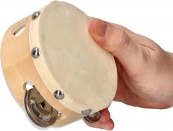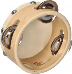 Tamburína má tradiční vzhled s přírodním dřevěným tělem a pevně uchycenými kovovými činelkami.