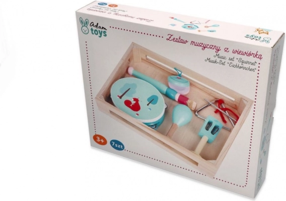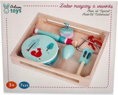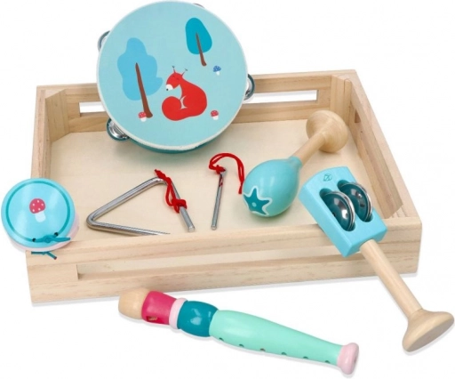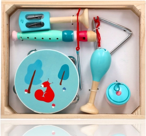 V sadě najdete tamburínu se čtyřmi rolničkami a milou veverkou, mátovou flétnu, maracas s květinovým motivem, kastaněty s houbičkou, ruční rolničky s lístkem, kovový triangl s paličkou a vše je uloženo v praktickém dřevěném tácu/krabičce pro snadné ukládání a přenášení. Skvělé pro domácí muzicírování, do školek i družin.