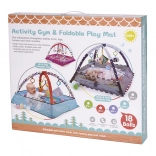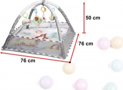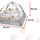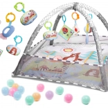 Jedna podložka - mnoho možností! Podložka s ohrádkou - dítě ležící na zádech nebo na bříšku může pozorovat okolní prostor. Ohrádka vytváří pocit bezpečí pro dítě i rodiče. Podložka s hračkami zavěšenými na obloucích - barevné hračky zavěšené na obloucích přitahují pozornost dítěte a motivují ho ke cvičení a posilování svalů krku, rukou a nohou. Navíc bude ideální pro první pokusy o samostatné sezení. Suchý bazén - naplněním ohrádky míčky získáte podložku bez oblouků - po odstranění oblouků síť tvořící ohrádku spadne dolů, pak bude podložka dokonalou izolací od chladné země, vymezí hrací zónu a úspěšně nahradí koberec v dětském pokoji. Barevná chrastítka a knížka s přiloženými šustícími stránkami upoutají pozornost batolete a budou stimulovat zrak, sluch a hmat. Navíc budou dokonalým úvodem do světa tvarů a barev. Moderní design a důraz na detail rodiče nadchne.