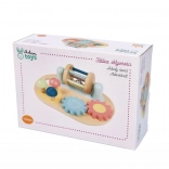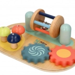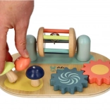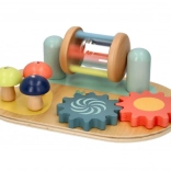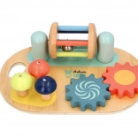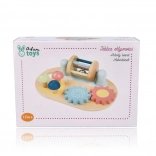 Dřevěná smyslová aktivní deska od značky Adam Toys nabízí barevnou smyslovou stimulaci a rozvoj jemné motoriky pro nejmenší děti díky rotujícím ozubeným kolům a houbám na hraní.