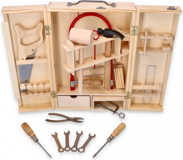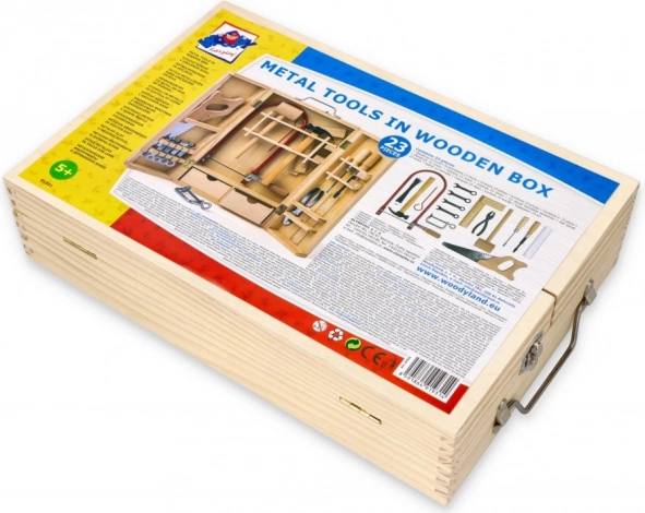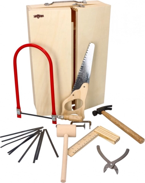 Tato kompaktní a přenosná sada obsahuje pečlivě uspořádané kovové nástroje v pevném dřevěném boxu s rukojetí. Díky jasnému uspořádání jsou všechny díly rychle po ruce a bezpečně uložené, což z ní dělá skvělou volbu pro malé kutily i rodiče, kteří ocení pořádek a bezpečnost.