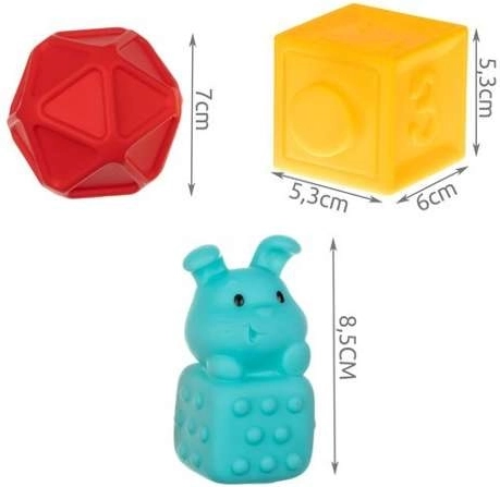 Mají krásné živé barvy, které dokonale stimulují vývoj vašeho dítěte. Díky speciálním prohlubním a výstupkům může dítě spojovat kostky do řad. Smyslové hračky formují schopnost přijímat, chápat a reagovat na podněty z okolí. Pomocí kostek můžeme zlepšit koordinaci pohybu a stimulovat smysly, jako je sluch, zrak nebo hmat. Bloky po stisknutí vydávají jemný klasický zvuk, který bude pro vaše dítě příjemným a zajímavým zážitkem. Bloky jsou vyrobeny ze speciálního měkkého materiálu, který je velmi měkký a lehký a neobsahuje žádné škodlivé látky, takže je lze používat jako kousátko pro batolata. Senzorické podložky jsou vizuálně atraktivní a mají pečlivou, precizní povrchovou úpravu. Jejich pestré barvy, různé tvary a velikosti přitáhnou dětské oči a jistě ho povzbudí ke hře.