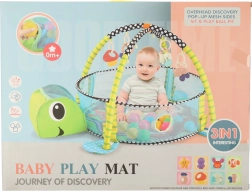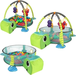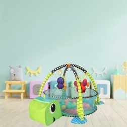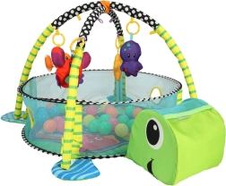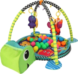 Tato multifunkční podložka přináší miminku bezpečný prostor pro objevování od prvních dní. Díky dvěma obloukům se závěsnými hračkami se dítě učí uchopovat, sledovat a koordinovat pohyby. Síťové okraje snadno vytvoří bazének s 30 barevnými míčky, který vybízí k samostatnému sezení a smyslové hře.