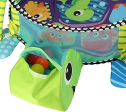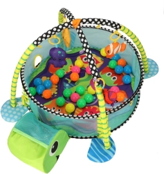 Součástí jsou měkké hračky ve tvaru rybičky, chobotnice, hvězdice a kraba se zrcátkem, které rozvíjejí zrak, hmat i pozornost. Lehká konstrukce se rychle skládá, takže je ideální na cesty i do menších prostor.