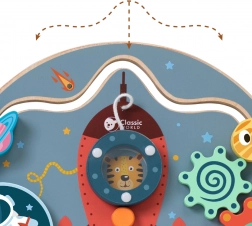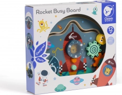 Dřevěná manipulační tabule ve tvaru rakety od CLASSIC WORLD nabízí 6v1 zábavných aktivit pro děti od 12 měsíců: labyrint, korálky, otočné kolečko, tlačítka, magnetický prvek a otáčecí knoflíky. Podporuje jemnou motoriku, koordinaci oko–ruka a kreativitu, je vyrobena z kvalitního dřeva a barvena netoxickými barvami.