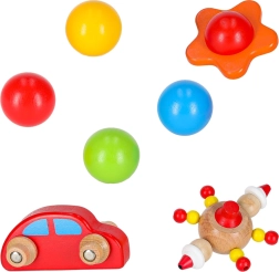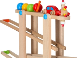 • Bohaté příslušenství – 4 barevné kuličky, dřevěné autíčko a figurky pro pestrou hru.