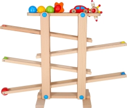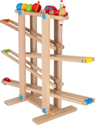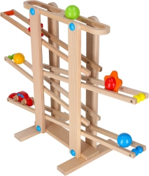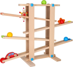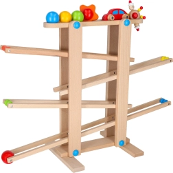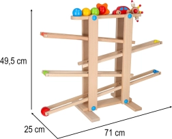 Všechny díly jsou pečlivě zabroušené pro bezpečné uchopení dětskou ručkou. Hra na závody rozvíjí koordinaci oko–ruka, vnímání příčiny a následku i trpělivost. Set je dodáván jako snadná samomontáž, přičemž v balení najdete vše potřebné včetně barevných kuliček a dřevěného autíčka.