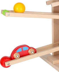Zig-zag rampy z hladkého dřeva zajišťují plynulý pohyb kuliček i autíčka a podporují koordinaci a trpělivost při hře.