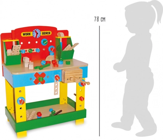 Pracovní stůl má robustní konstrukci a dostatek prostoru pro šroubování, stavění a fantazijní hru. Součástí balení jsou díly a doplňky podle obrázků, aby mohly děti okamžitě začít tvořit.